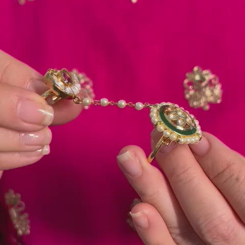 Discover modern elegance with this stunning two-finger ring, featuring two distinct ring connected by a delicate white bead chain. One ring showcases a beautiful kundan flower in gold and green hues, elegantly surrounded by delicate pearls, while the other resembles a flaming diya adorned with vibrant red and white stones. This adjustable ring is designed to fit comfortably on any finger, making it a versatile addition to your jewelry collection.