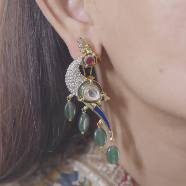 A breathtaking tribute to the elegance of the peacock, these earrings feature dazzling kundan centers framed in rich green and blue enamel. The crescent encrusted with shimmering stones adds a celestial charm, while ruby accents bring a regal touch. Dangling emerald-hued drops create graceful movement, embodying timeless opulence. An enchanting blend of artistry and tradition, perfect for grand celebrations.