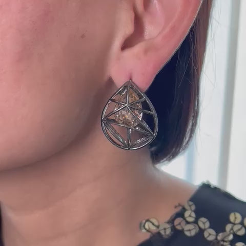 These geometric drop-shaped studs feature a rose pink Swarovski crystal at their center, combining sophistication with a bold edge. The unique design highlights exceptional craftsmanship, making them a captivating statement piece. Whether for a special occasion or everyday wear, these earrings will instantly elevate your look with their modern elegance and striking appeal.