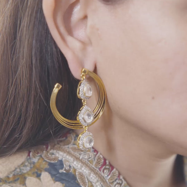 A modern fusion of tradition, these earrings feature crescent gold arcs with dangling polki stones. The layered hoops add a contemporary touch, while the uncut diamonds exude regal charm. Inspired by celestial beauty, they capture the essence of the moon’s radiance.