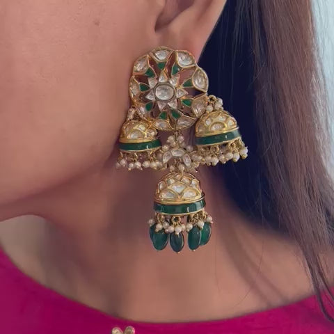 These gold-plated dome-shaped kundan jhumkas are exquisitely designed, featuring a charming green and white stone flower at the center. Adorned with elegant green drops, they are the perfect accessory to complement any traditional outfit.