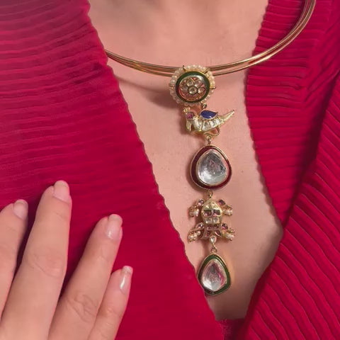 This beautifully designed round-shaped necklace is adjustable to fit any size, ensuring both comfort and style for effortless wear. It features an elegant arrangement of kundan flowers adorned with lustrous white pearls, beautifully complemented by a delicately crafted bird with deep red and navy blue enamel detailing. The design is further enhanced by rich red kundan stones and charming fish motifs embellished with white and red stones. To complete the look, the necklace is accented with vibrant green kundan pieces, making it a stunning addition to any jewelry collection,
