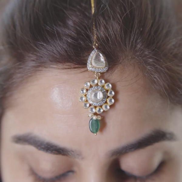 Inspired by Rajputana royalty, this maang tikka showcases uncut polki in a grand, handcrafted setting.
