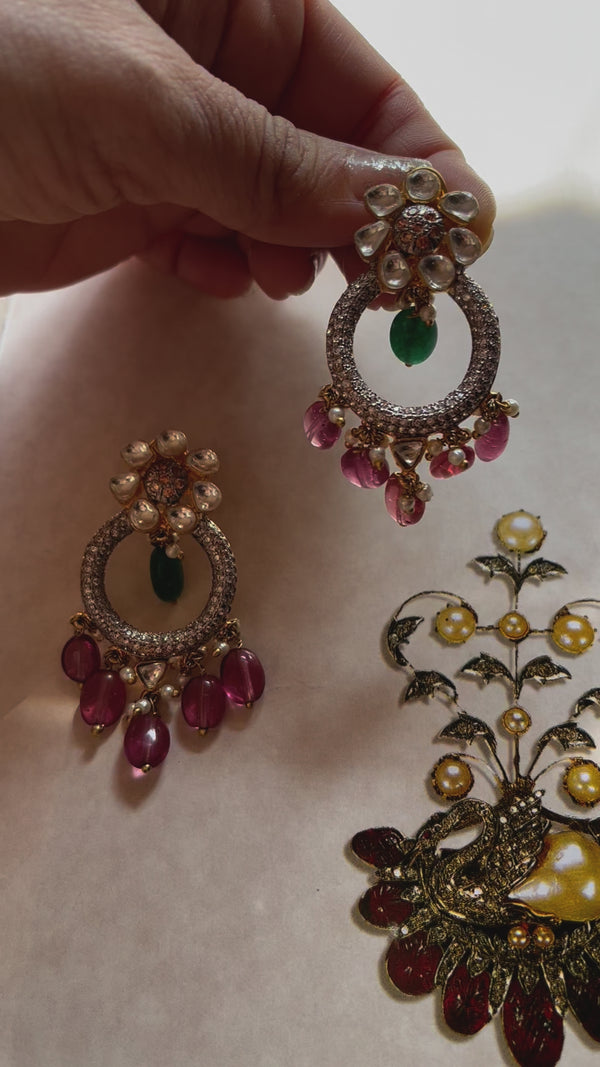 Nadira Earrings features a captivating flower-shaped design adorned with shimmering stones, evoking the splendor of a blossoming garden. Below the exquisite flower, a vibrant green droplet gracefully hangs, adding a fresh and invigorating touch to the ensemble. Completing the floral symphony, delicate pink droplets dangle beneath, imbuing the earrings with a soft and romantic allure.